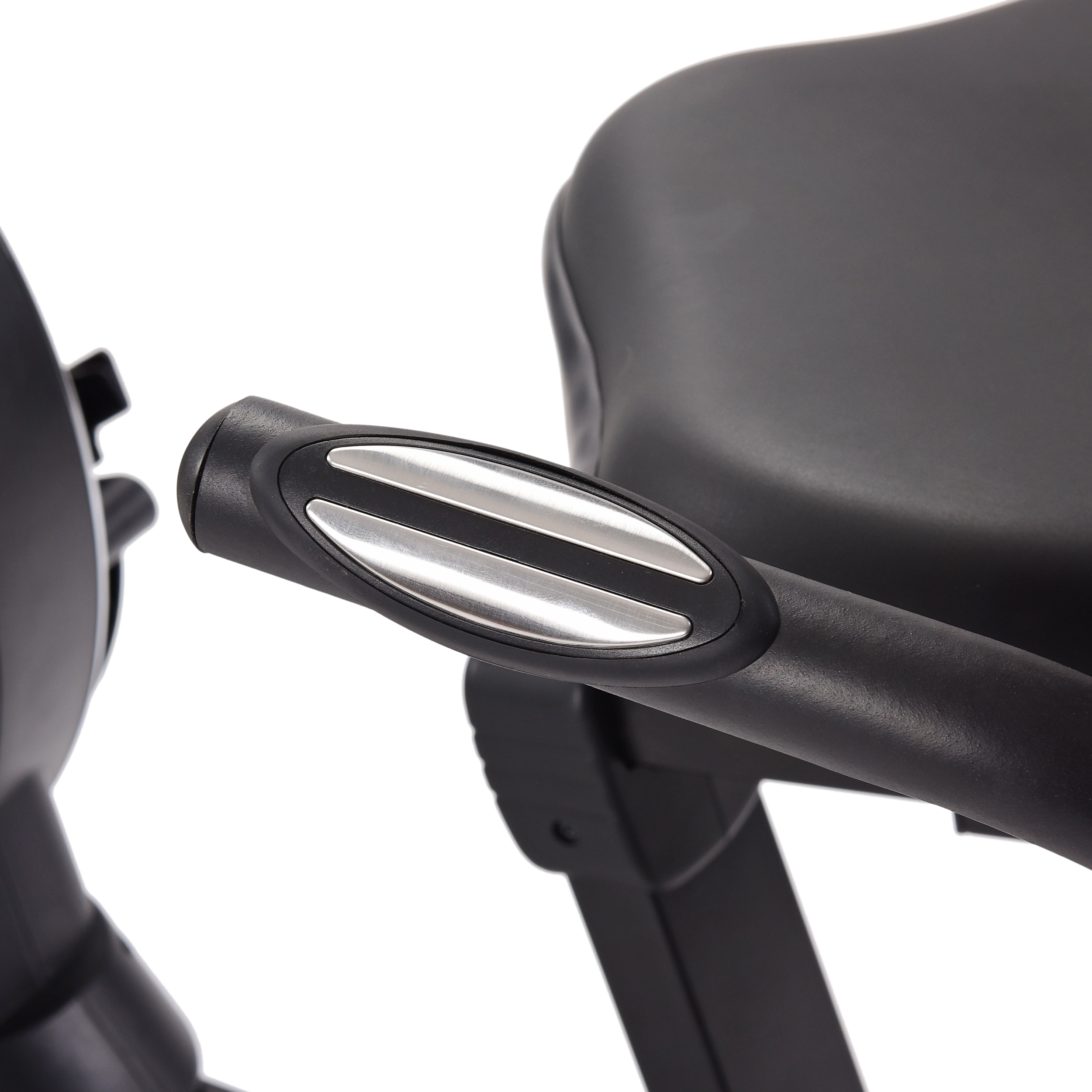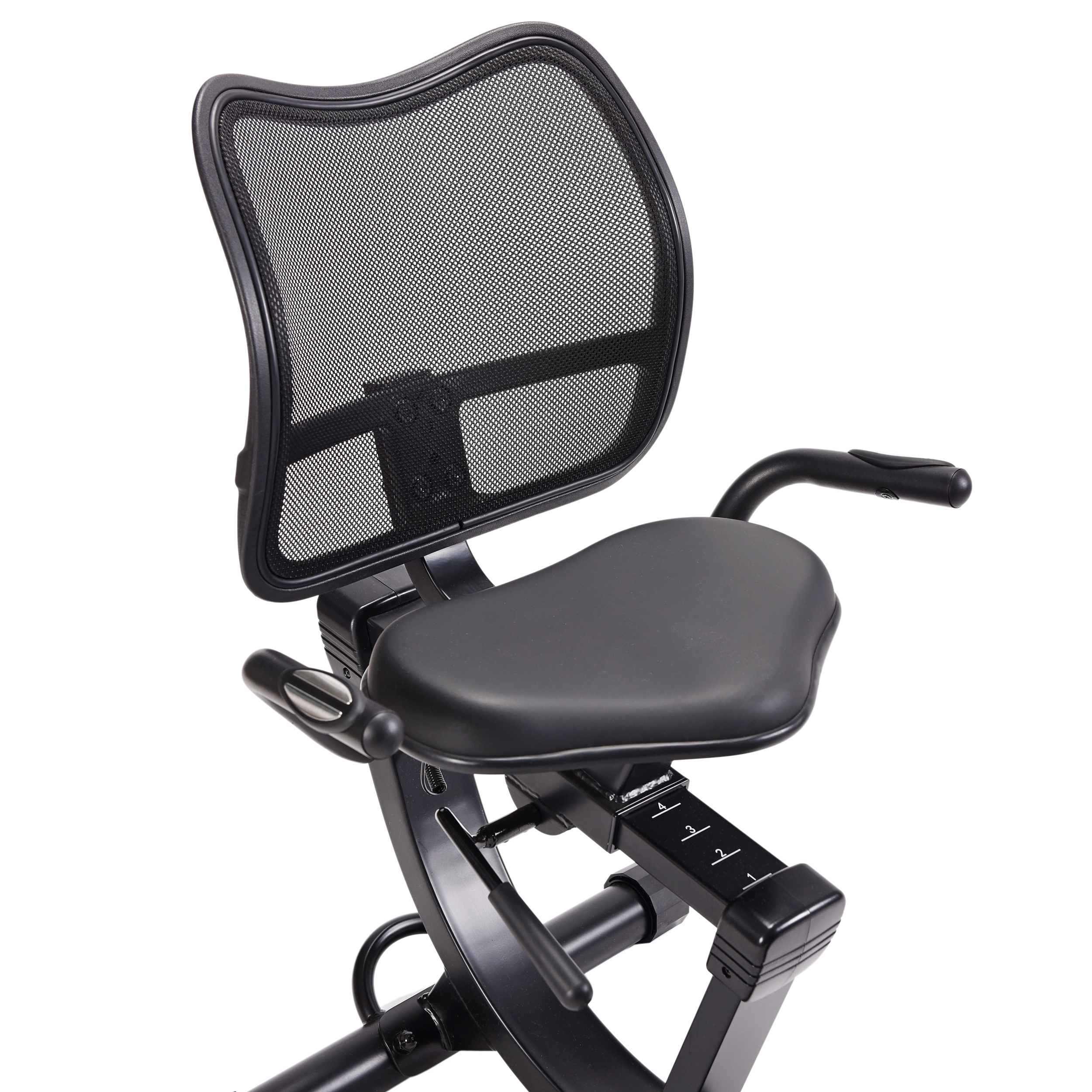 Padded handlebars. Adjustable, padded seat and backrest. Textured pedals with adjustable strap.