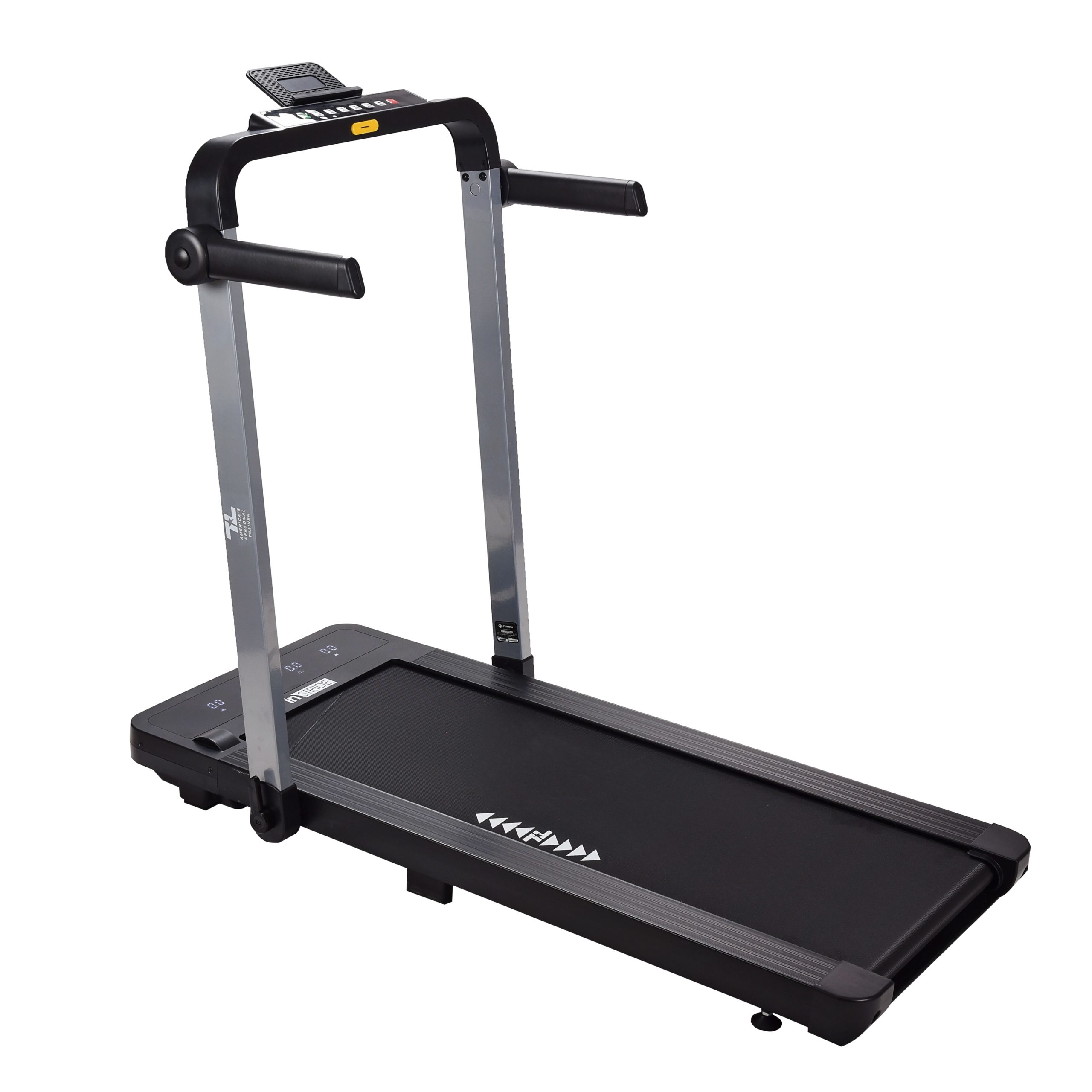 Featuring a quiet yet powerful 1hp brushless motor, this treadmill allows speeds ranging from 0.5 to 7.5 mph with the handlebars in the upright position. A distinctive feature of the Tony Little InStride Treadmill is its “Desk Mode,” activated when you fold the arms down, limiting the speed to 0.5-2.5 mph. In Desk mode, easily roll the treadmill under your desk or workstation, enabling you to accumulate steps while staying productive. The controlled speed lets you focus on your tasks while ensuring your safety.